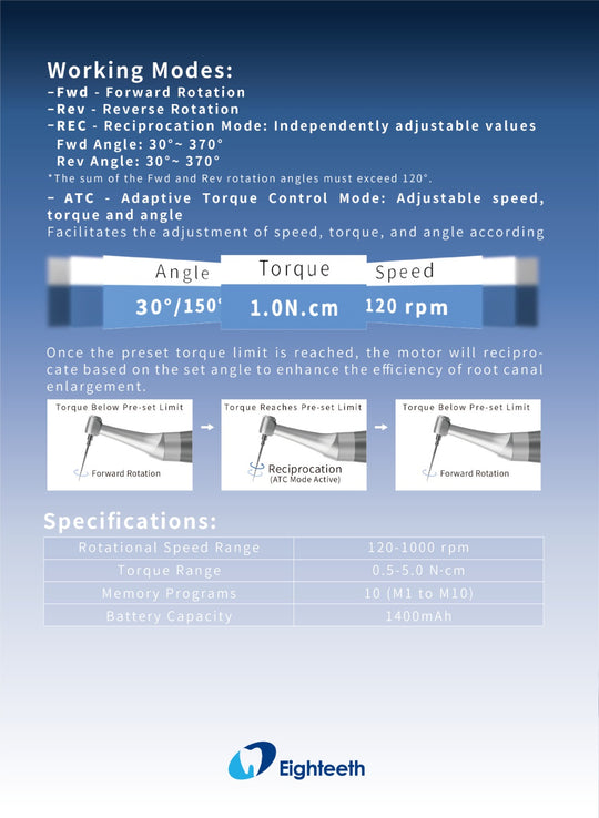 E-CONNECT Cordless Endo Motor Features: Five Reciprocation-Four Modes(M0) Reverse Reciprocation-One Mode Counter clockwise & clockwise movement (Fwd 30°-Rev 150°. For reciprocating files); Clockwise& counter clockwise movement 1. Fwd 150°-Rev 30° | Fwd 180°-Rev 30°2. Fwd 210°-Rev...Regular price د.إ.1,600.00 -